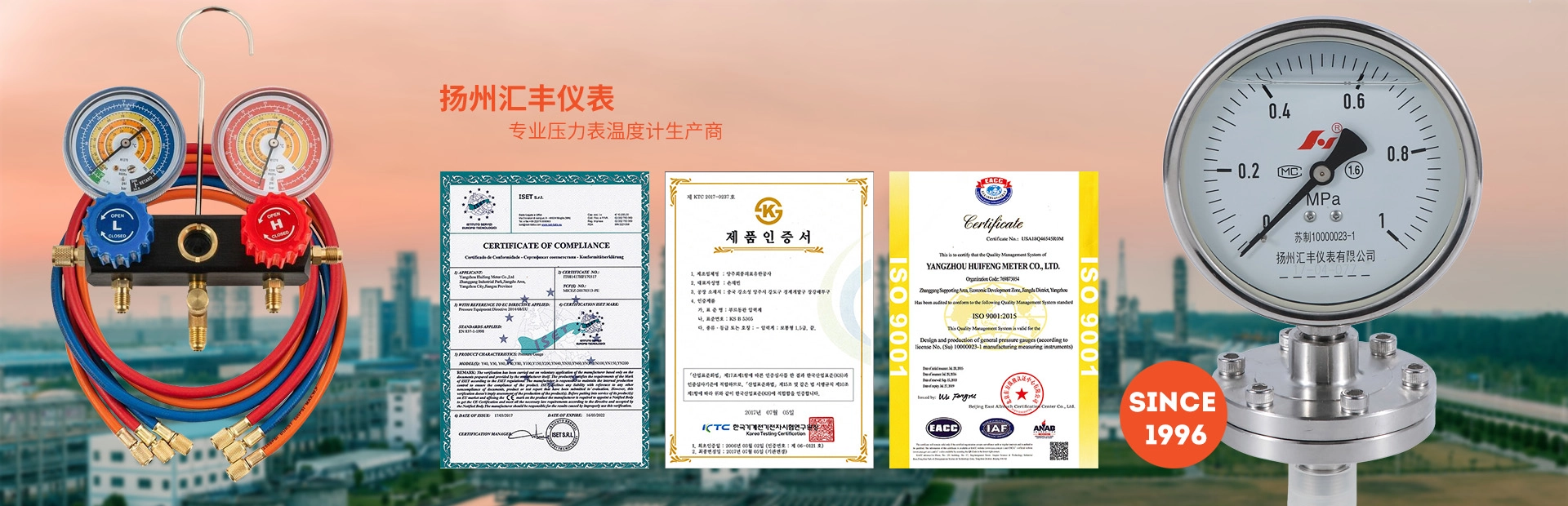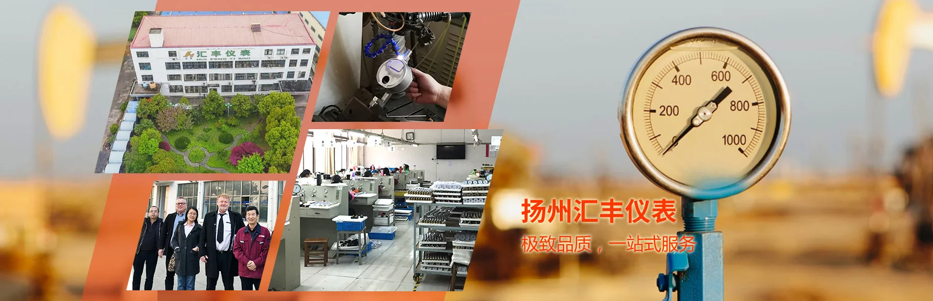 扬州汇丰仪表有限公司是一家专业生产各种压力表及温度计的厂家,创建于1996年,现有员工200多人,主要生产普通压力表、充油耐震压力表、压力真空表、锅炉压力表、空压机压力表、全钢压力表(石油化工行业用)、冷媒压力表、医用表、氧气、乙炔减压表、数显表、温压表、双金属温度计、压力式温度计、流量计、压力传感器等。